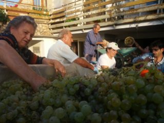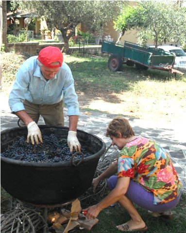 It’s all hands on deck to get the grapes in and as you can see from the photograph below, all the big pots and pans are used in the making of grape jam. The only space for this was in the garden!