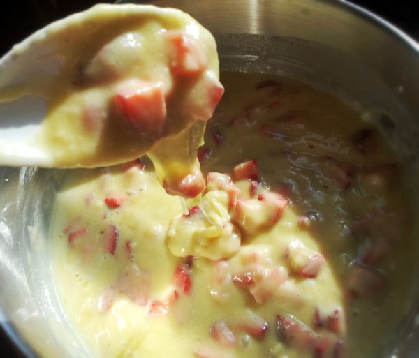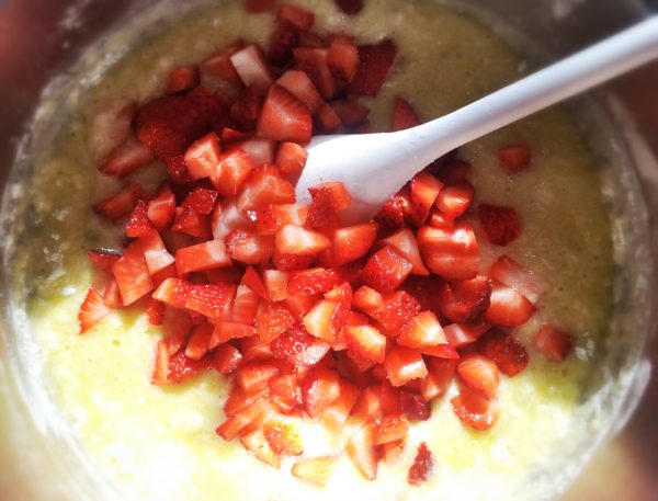 - Add the fresh strawberries and don’t worry if you squash a few as you mix them into the batter.
