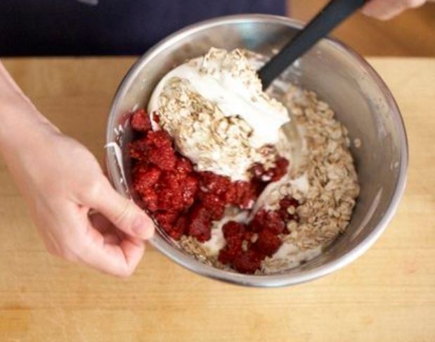 - Fold in two thirds of the raspberries very carefully, cover the bowl and refrigerate for up to 30 minutes until you are ready to serve it.