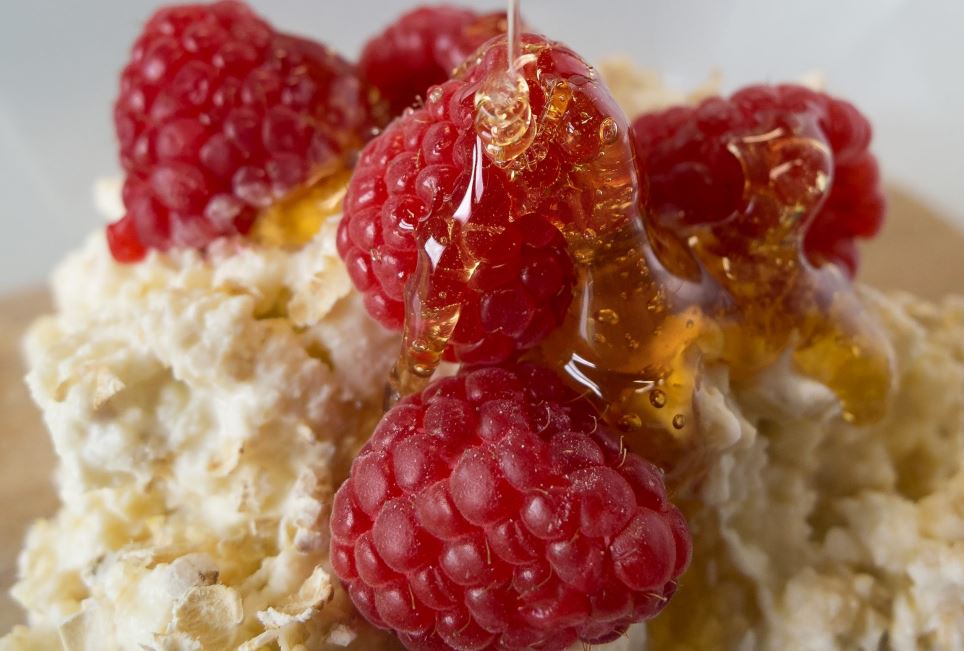 - To serve, divide the some of remaining raspberries among the dessert glasses, reserving the rest for topping. Divide the Cranachan among the dessert glasses, top with the remaining granola and raspberries then drizzle with honey.