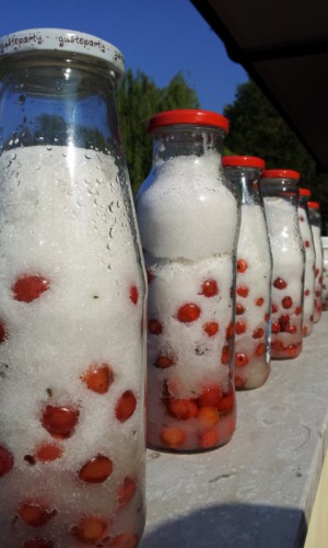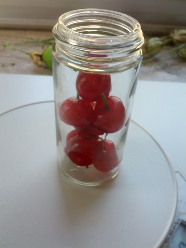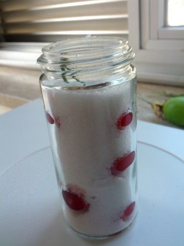 - Starting with the sugar, layer the cherries with the sugar in the jar until the jar is full and the final layer is sugar