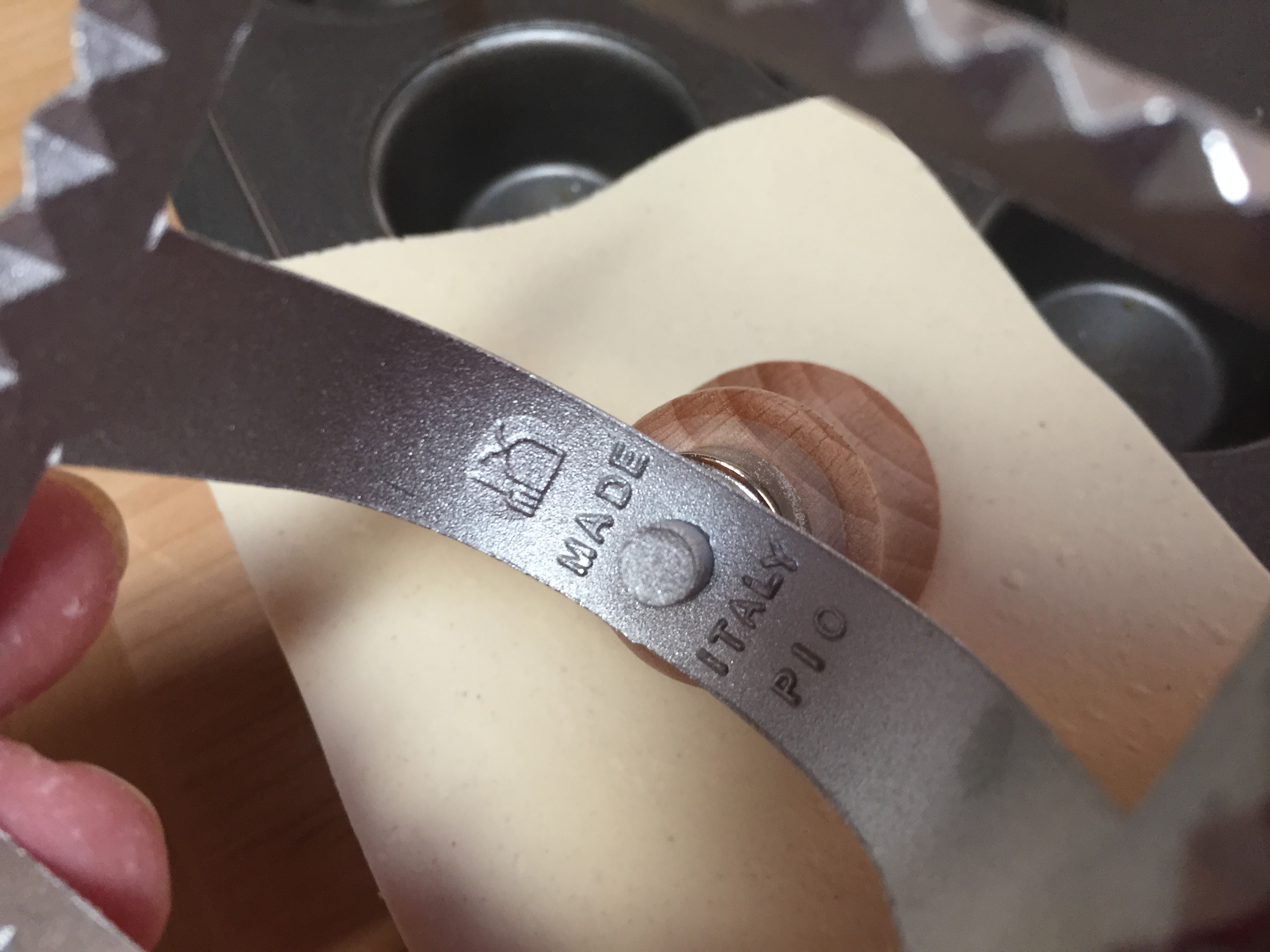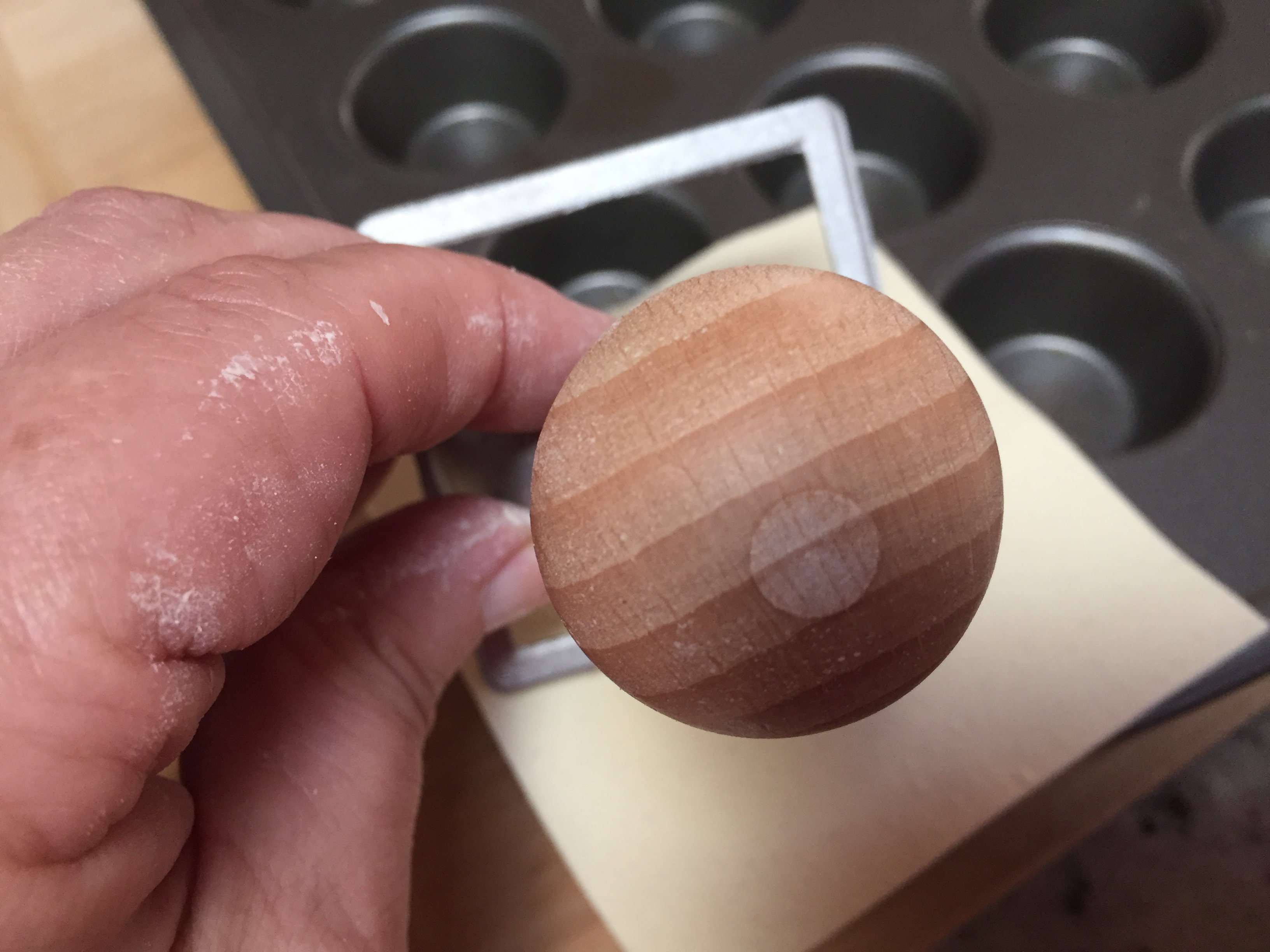 Next we laid the pasta dough over the cavity of a mini muffin. It turns out that the handle of one of our ravioli cutters is the perfect size for pressing the dough into the cavity.