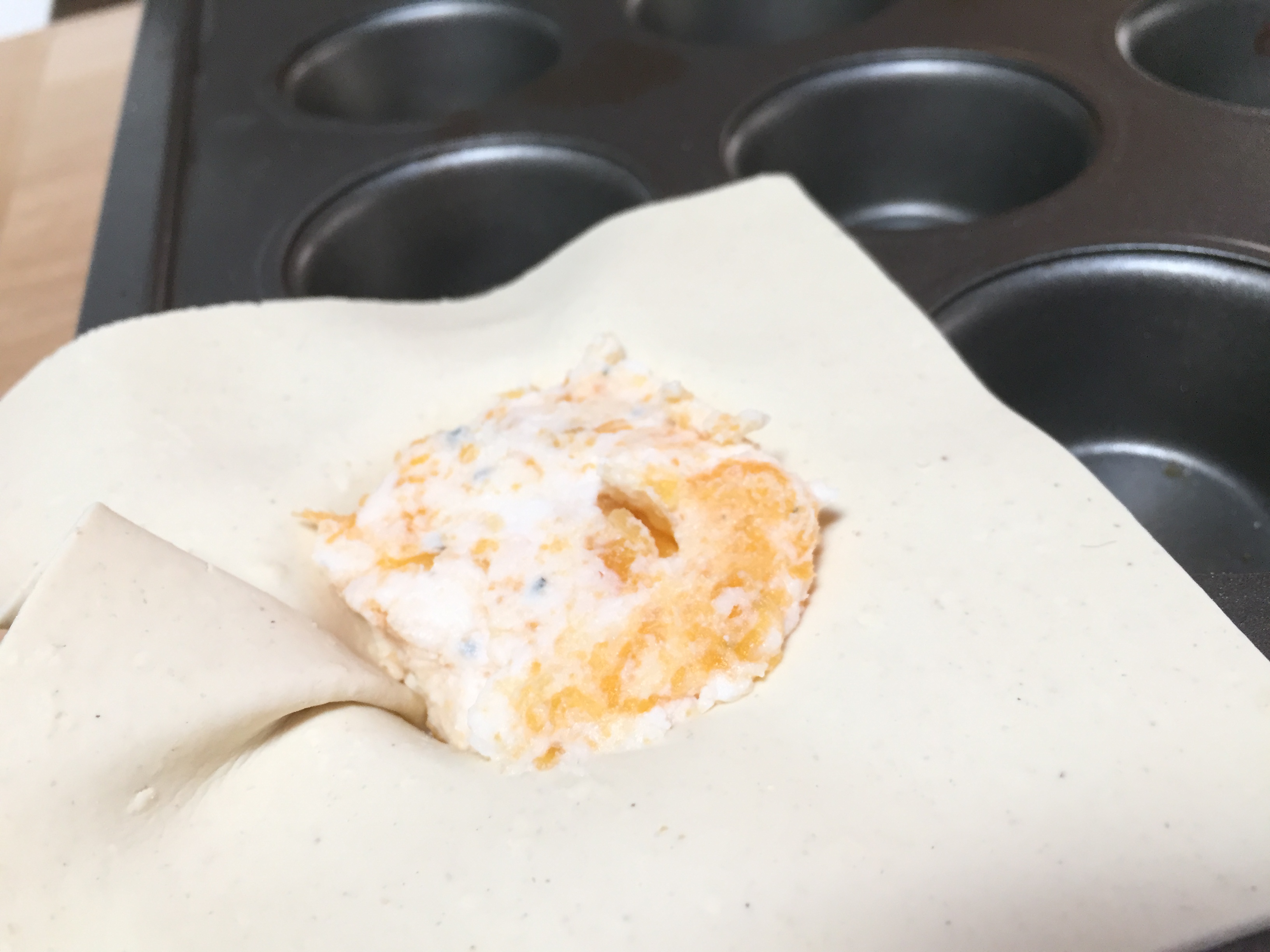 The dough was rolled out to the thickness of a lasagna sheet just as we do for all of our ravioloni and tortelloni. We used a mini muffin tray to achieve the perfectly sized fagottini and so it was necessary to cut the rolled out dough into 4″ squares.