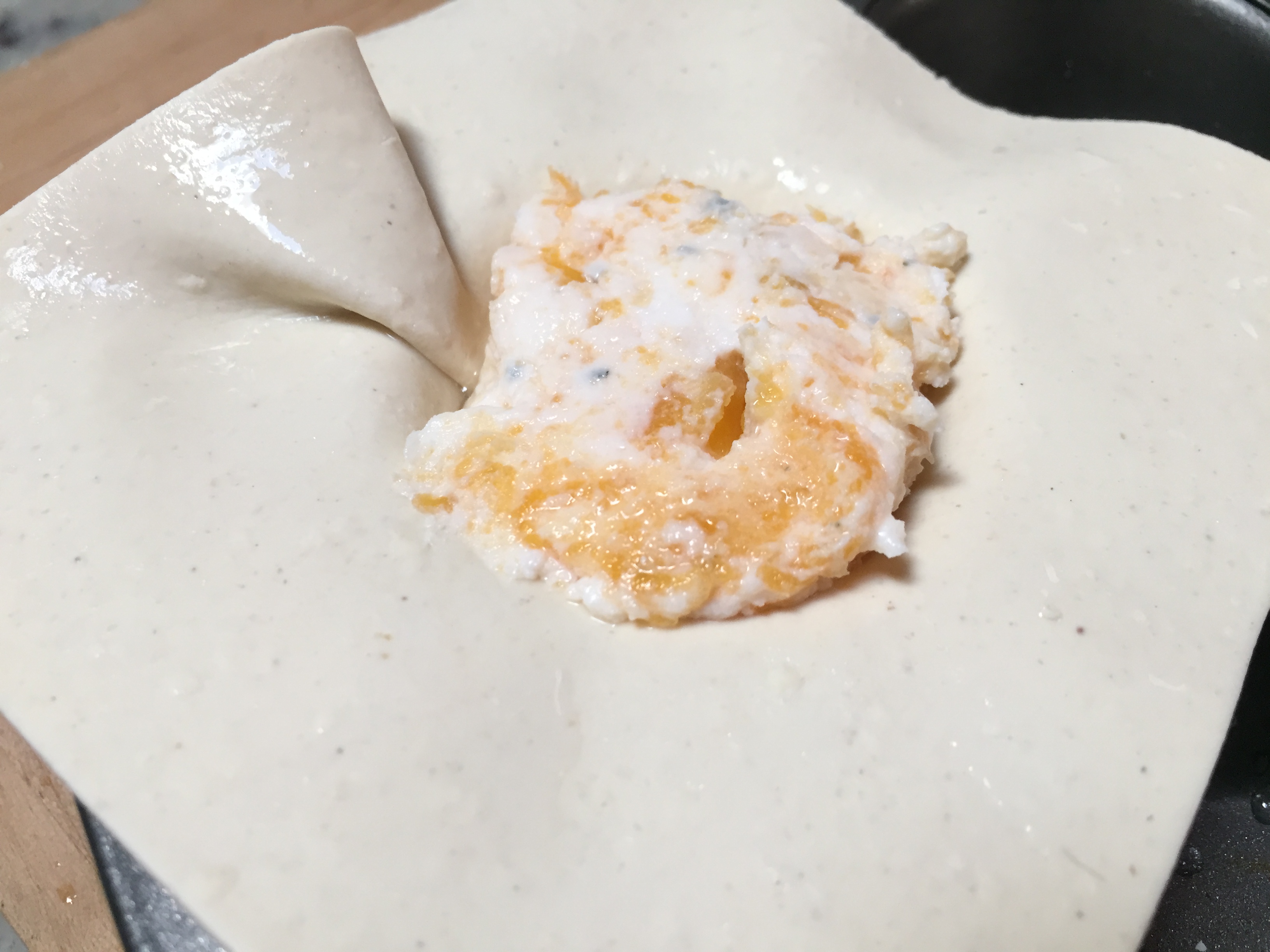 Once the cavity is formed into the dough, you fill it with your favorite ravioli filling. We happened to have some butternut squash and ricotta handy. We filled the cavity level with the tray. We then spritzed the outer sheet of pasta with a little water. Next, we carefully removed the near-ready fagottini and carefully brought together the pasta to form a little parcel.