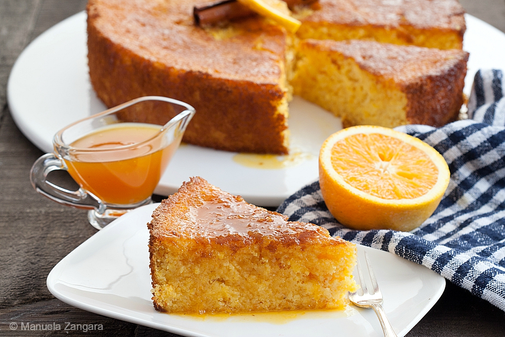 - Remove from the oven and allow to cool completely. Release the sides of the pan and invert cake onto a cake platter. Drizzle with orange juice and honey while the polenta cake is still warm.